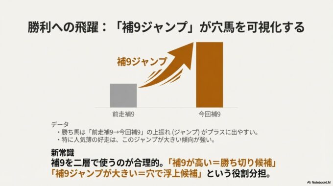 - 補9ジャンプ(上昇幅):穴馬を合理的に抽出する鍵。大きなジャンプが期待できる馬は投資価値あり。