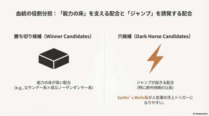 血統を「この系統が強い」という単純な見方じゃなくて、勝ち馬と穴馬で役割が違うと考えましょう。