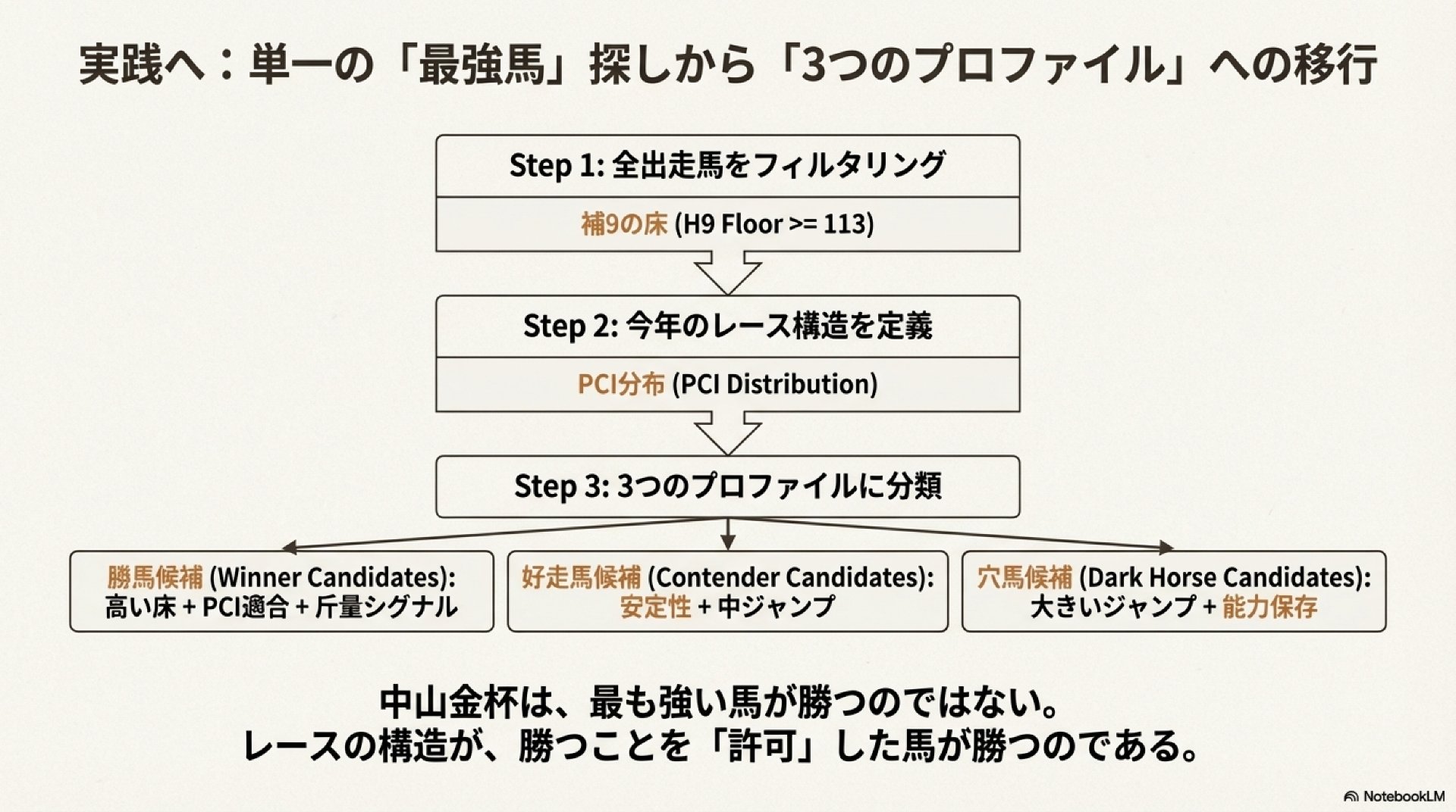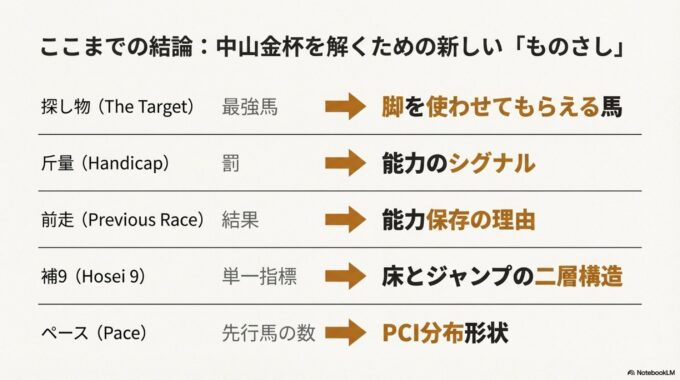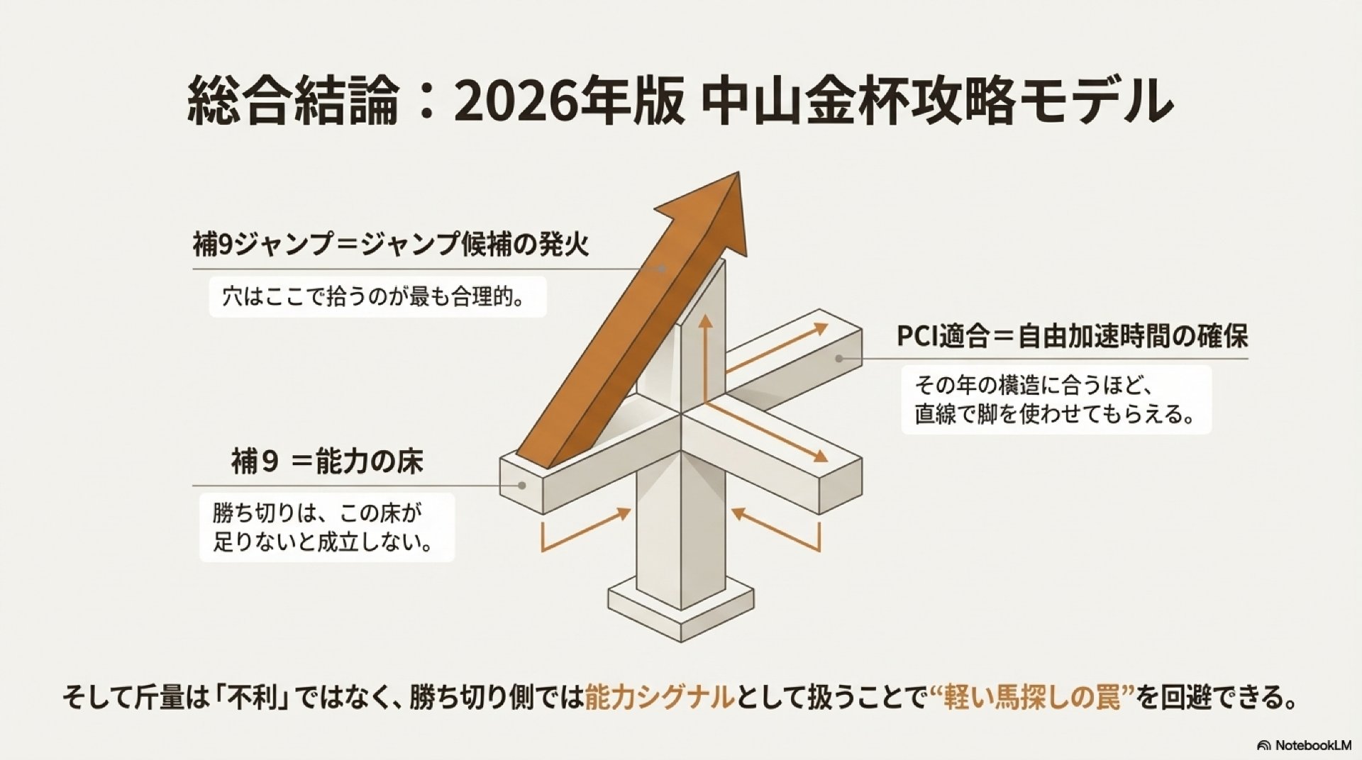 これまでの分析を集約すると、2026年の中山金杯を攻略するフレームワークは3つの軸で成り立ちます。
