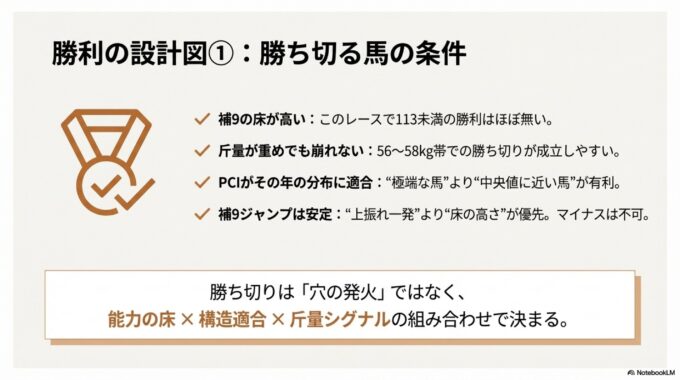 勝ち馬選びは穴狙いとは違います。能力、レース構造適合、斤量シグナルの3つを高いレベルで満たす馬を、冷静に判断することです。