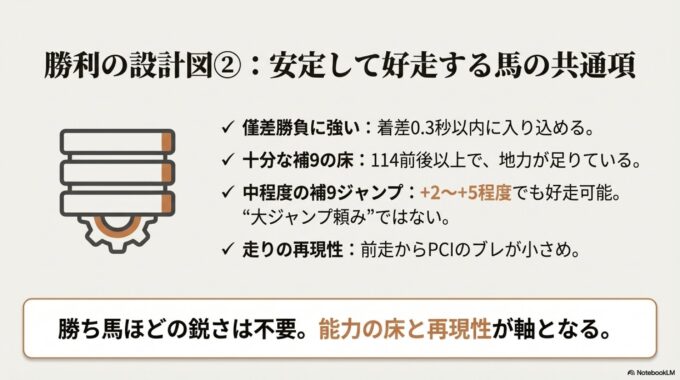 選定軸は、勝ち馬の鋭さより「能力の床と再現性」。堅実に上位争いできる馬を見抜くことです。