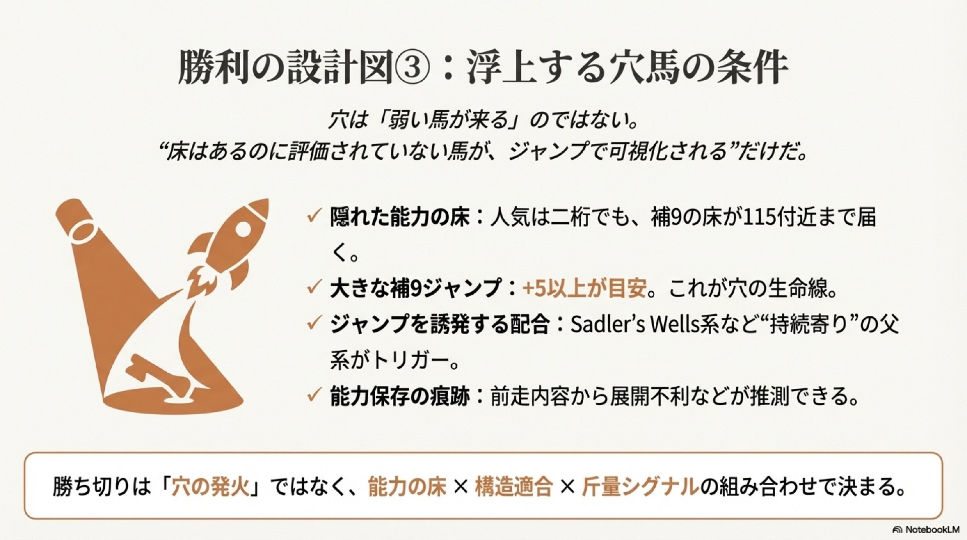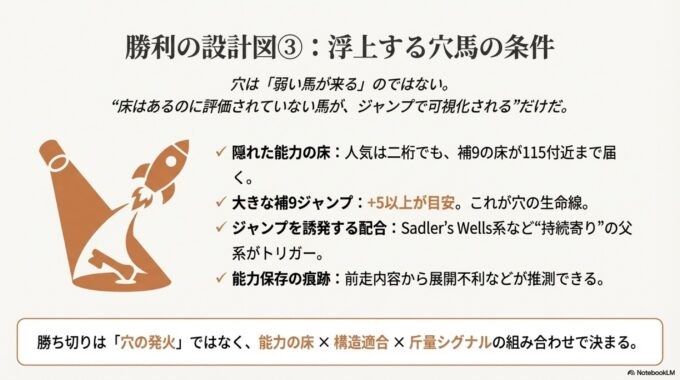 穴馬の本質は「弱い馬が運で好走」じゃありません。力はあるのに評価されていない馬が、ジャンプで可視化される現象です。