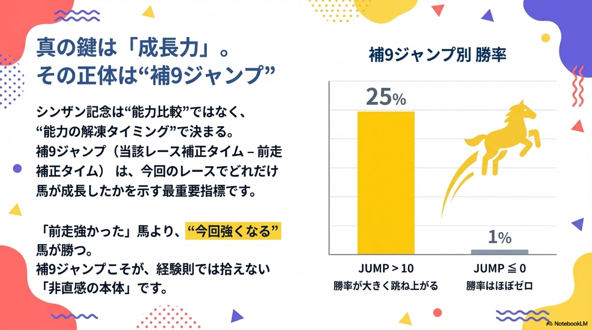 - 明確なプラスの「補9ジャンプ」: 「前走強かった」ことより、「今回強くなる」ことが絶対条件である。潜在能力がこのレースで一気に開花する、爆発的な成長力が求められる。