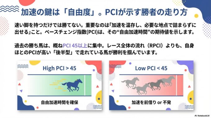 「PCI(ペースチェンジ指数)」は、レースにおける加速の温存度合い、すなわち「自由加速時間」を確保する能力を示す指標である。これは、ゴール前の直線で他馬に邪魔されることなく、スムーズに加速できるポテンシャルを数値化したものと言える。
