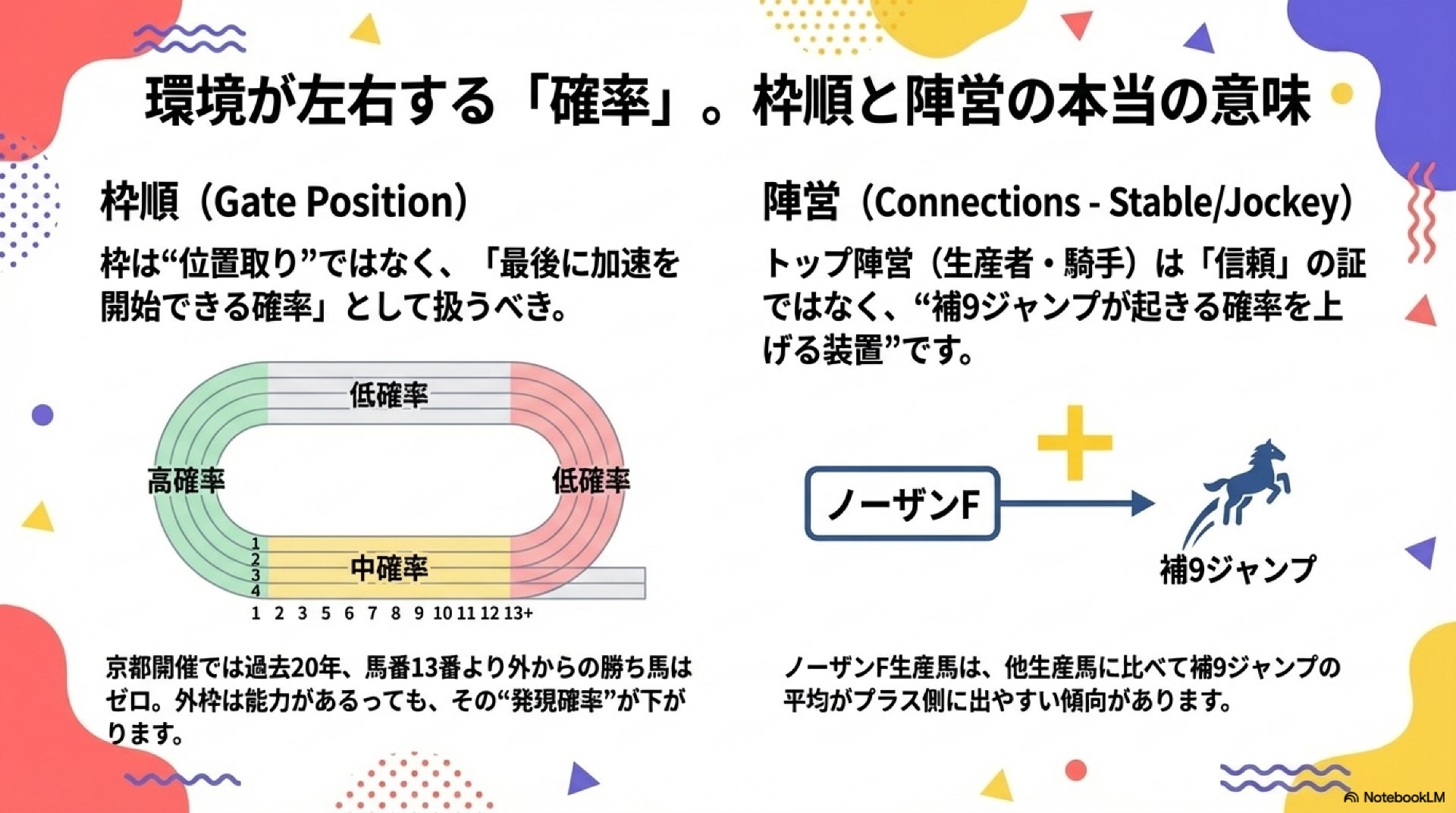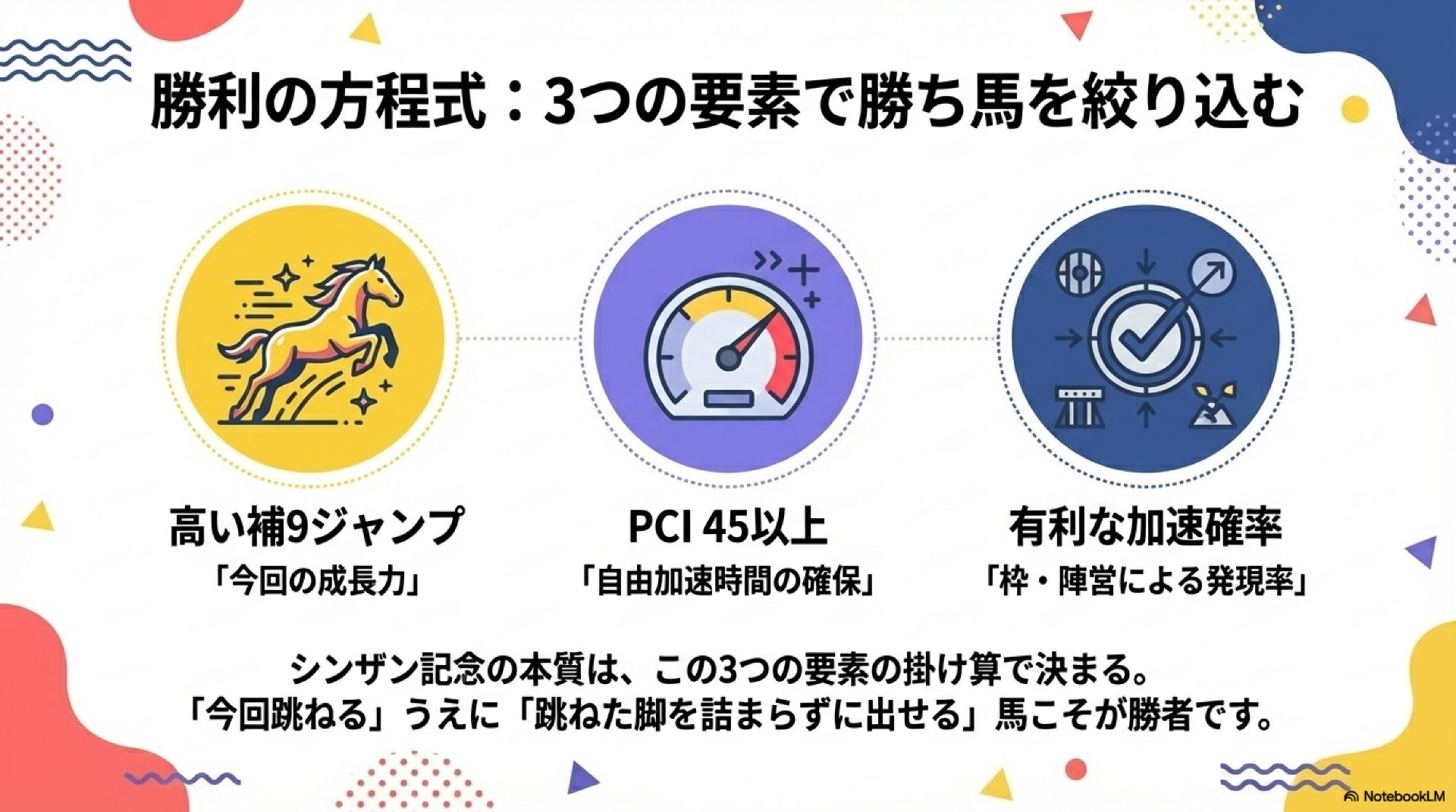 勝利とは、潜在能力がこのレースで開花し(ジャンプ)、その爆発的な加速を他馬に邪魔されずに発揮できる(高いPCIと有利な枠)馬にのみもたらされる必然的な結果なのである。