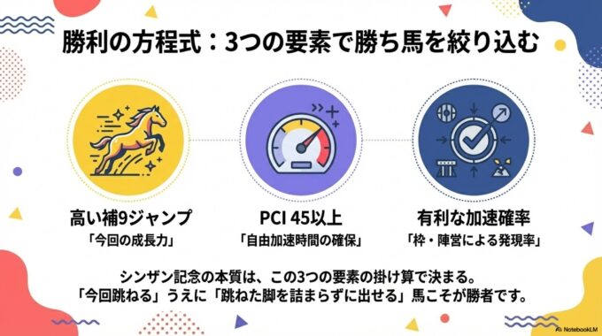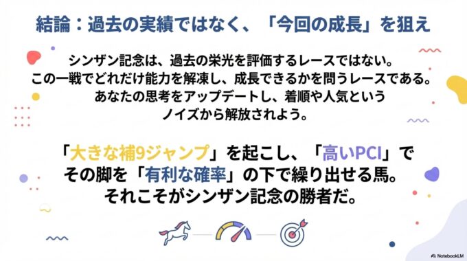 本レポートの分析を通じて、シンザン記念の本質が、前走の格や人気といった過去の実績ではなく、以下の3つの要素の掛け算によって決定されることが明らかになった。
