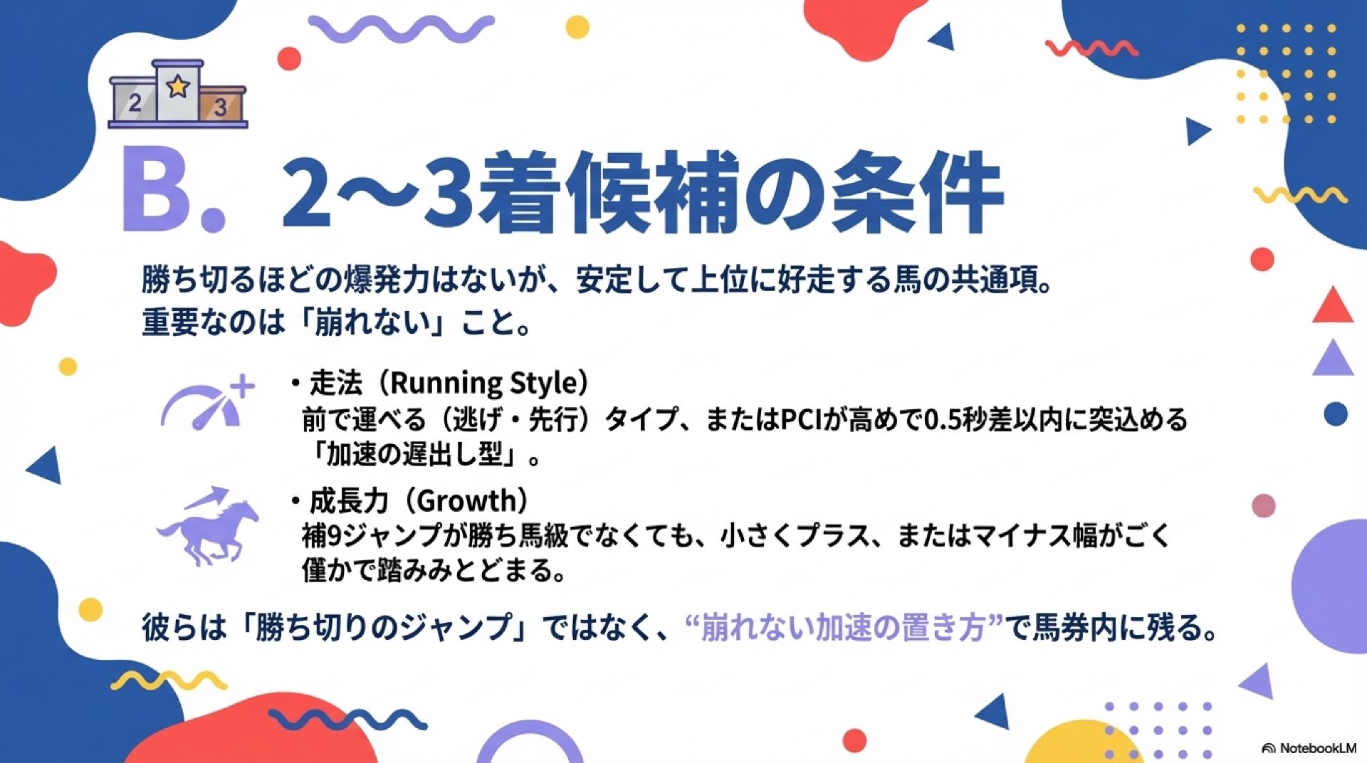 B. 好走馬(2~3着)の条件:「崩れない」レース運び