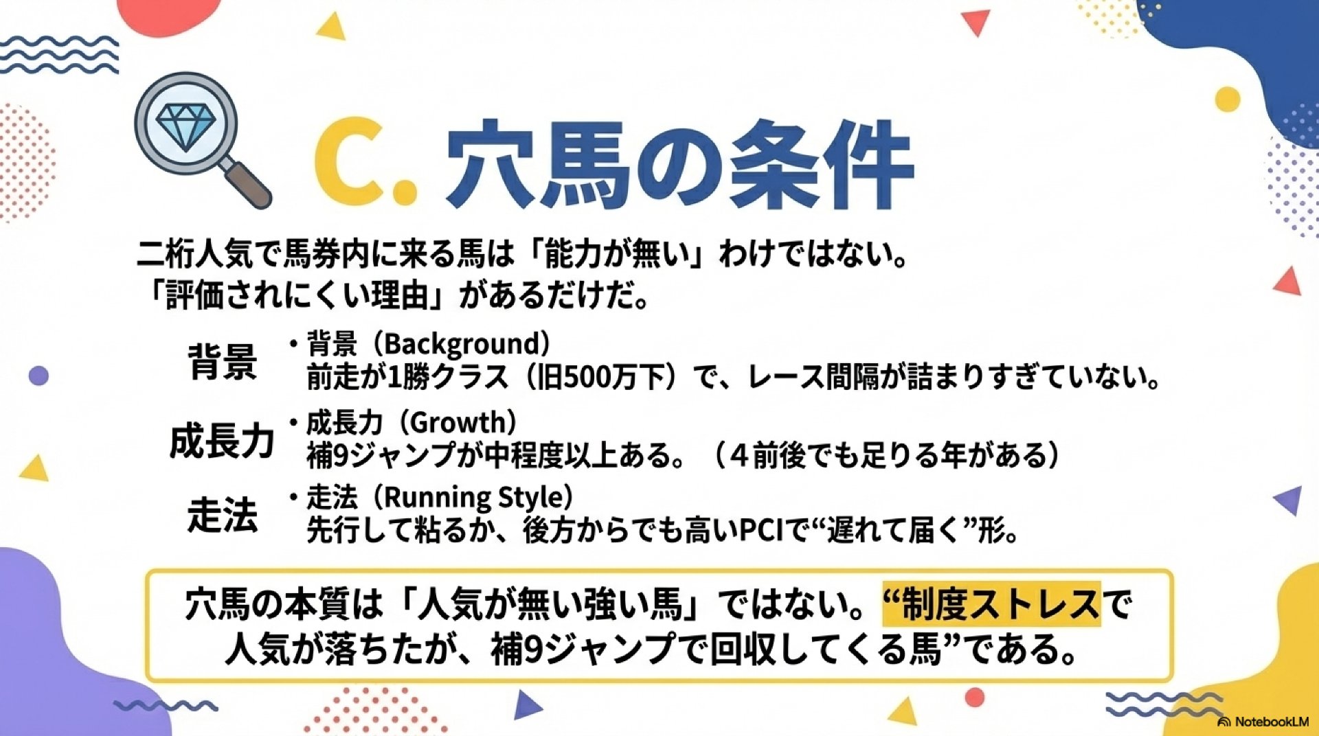 結論として、穴馬とは「能力の劣る馬」ではない。それは「制度ストレスという市場のバイアスによって過小評価された、補9ジャンプ候補」に他ならない。