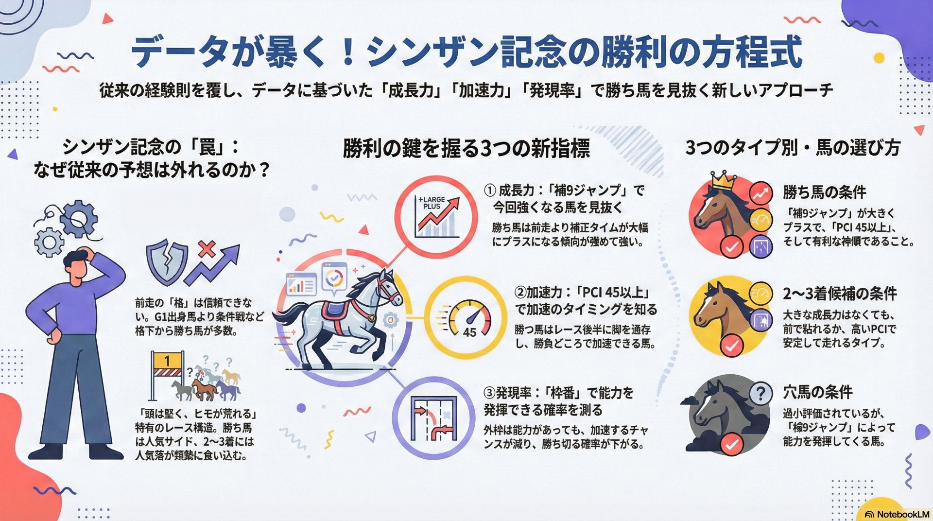 本レポートは、過去20年間の膨大なレースデータに基づき、独自の分析指標である「補9ジャンプ(能力の解凍タイミング)」と「PCI(自由加速時間の確保能力)」を駆使する。これらの指標は、競走馬の潜在的な成長力と、レース展開の中でその能力を最大限に引き出すための条件を可視化し、「このレースで強くなる馬」を特定するための、明確かつ再現性の高いアプローチを提示する。