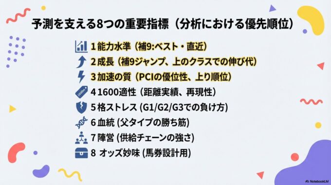 まず、どんな指標で馬を見るかを整理しておきます。若駒の未来の可能性を測るための物差しです。