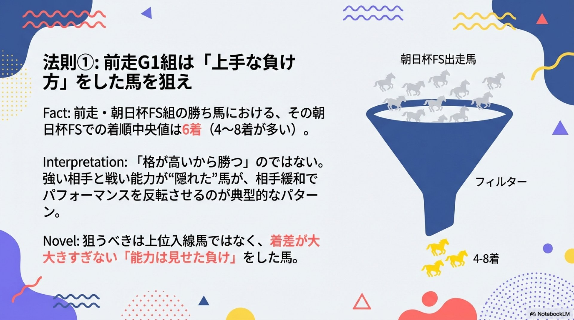 だから朝日杯組を見る時は、上位入線馬より「着差が大きすぎずに敗れた馬」つまり能力の片鱗は見せたけど結果に繋がらなかった馬を狙うべきです。