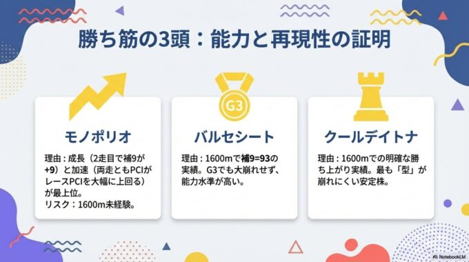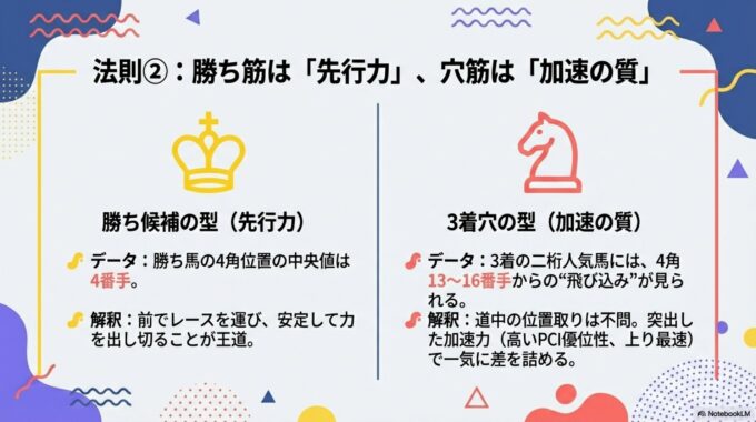 つまり「勝ち馬候補」と「3着穴候補」は別のロジックで選ぶべきなんです。勝ち馬は前でレースを運べる馬、3着穴は加速力に秀でた馬。
