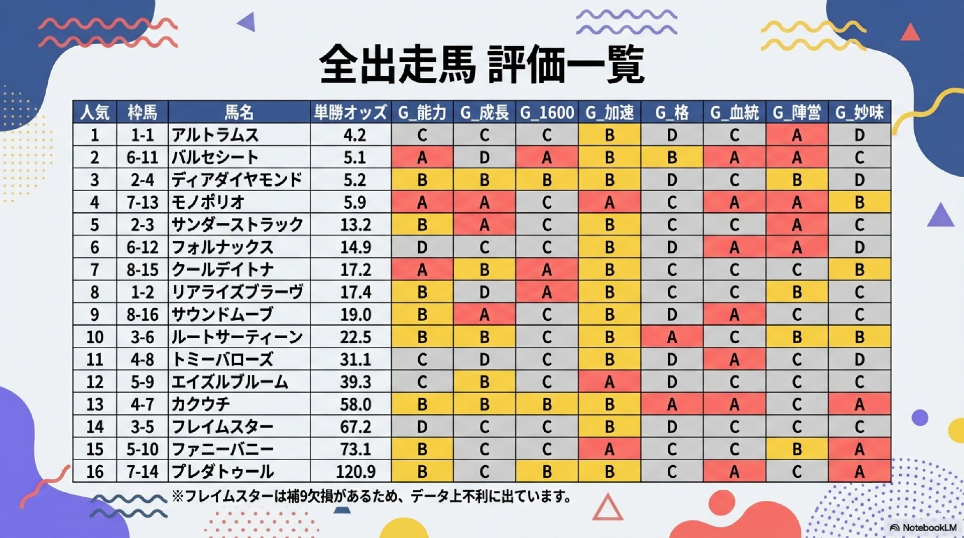 陣営評価は確かに高いんだけど、データ上はキャリア1戦のみで補9がまだ上位馬に足りてない。これって「情報人気」が先行してるだけで、データ的な裏付けが弱いんですよね。