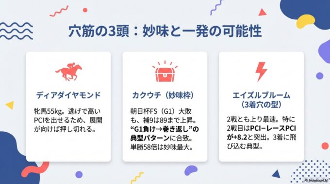 その分、カクウチとエイズルブルームをポートフォリオに組み入れました。過去20年で繰り返し出現してる「格負け巻き返し」と「3着穴」のパターンに対応するためです。