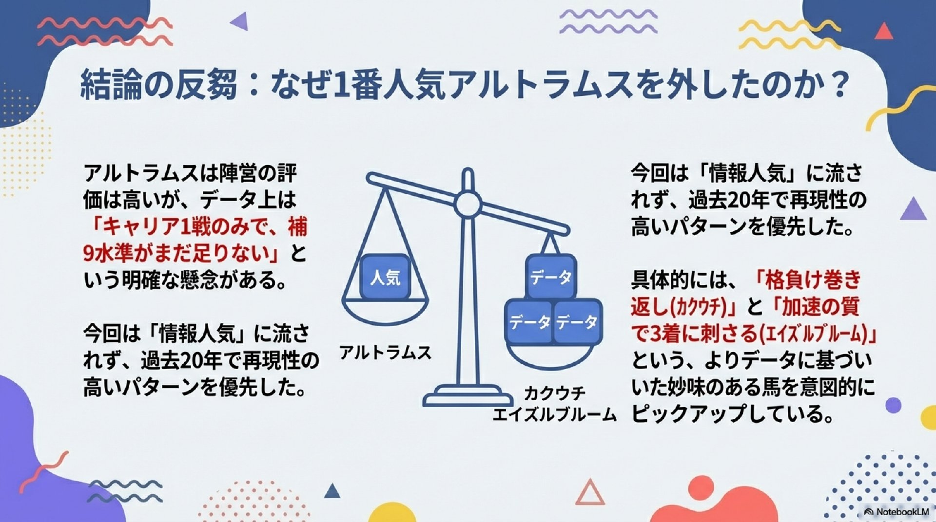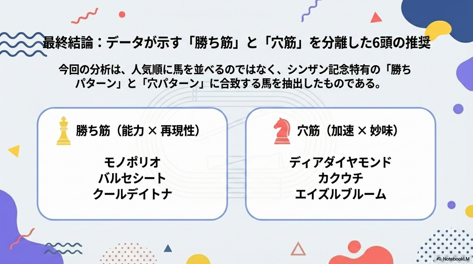 データが示す「勝ち筋」と「穴筋」を組み合わせた、戦略的な勝負をしたいと思います。