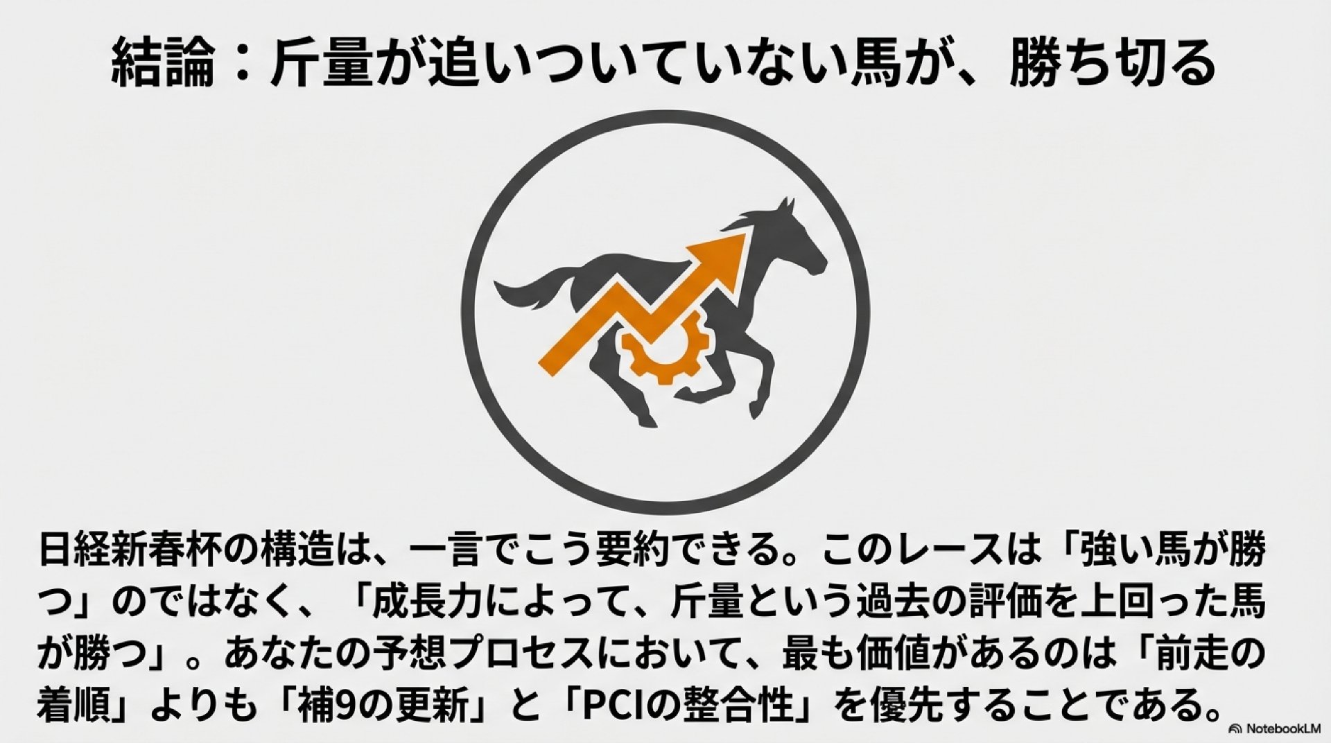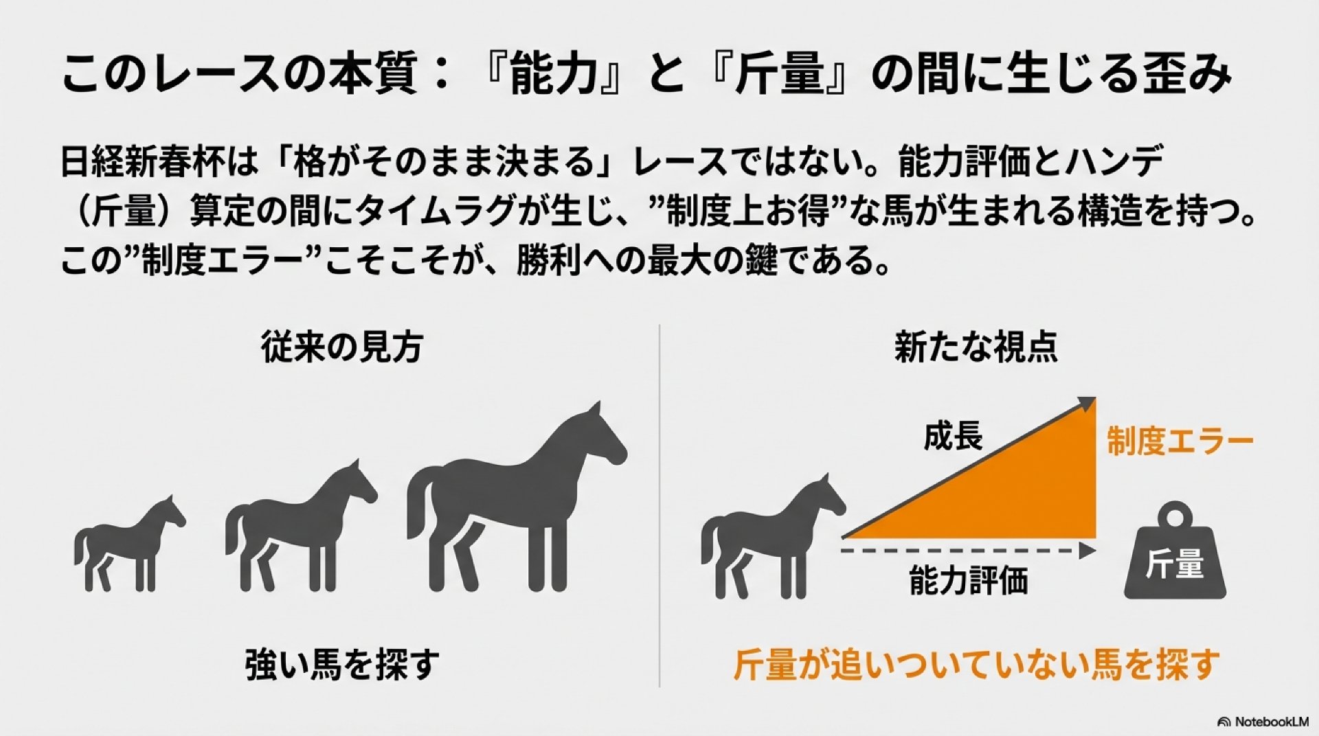 求められるのは、「斤量という制度が、馬の現在の能力(特に急激な成長)に追いついていない”制度エラー”を見つけ出す」こと。