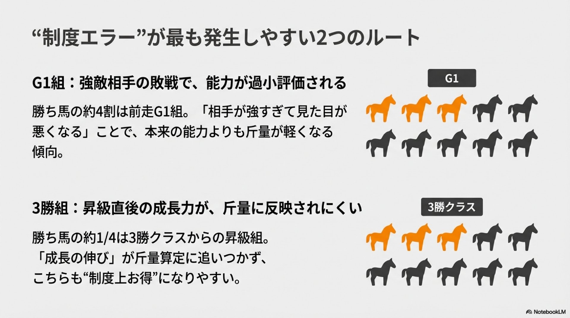パターン2:3勝クラス組 昇級直後の馬は、急激な成長力が斤量算定に完全には反映されにくい。これも典型的な「制度エラー」の発生源。