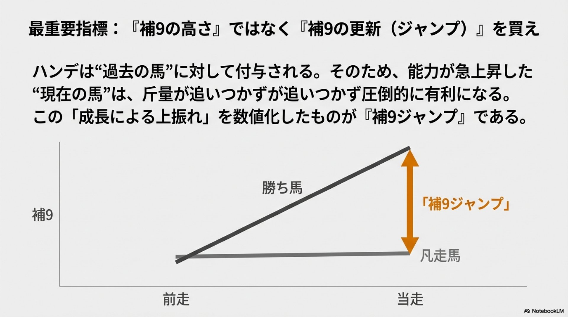 「補9ジャンプ」は、この時間的な乖離を数値化したもの。能力が急激に開花した馬は、”現在の能力”が”過去の斤量設定”を大きく上回るという制度上のアドバンテージを享受できる。