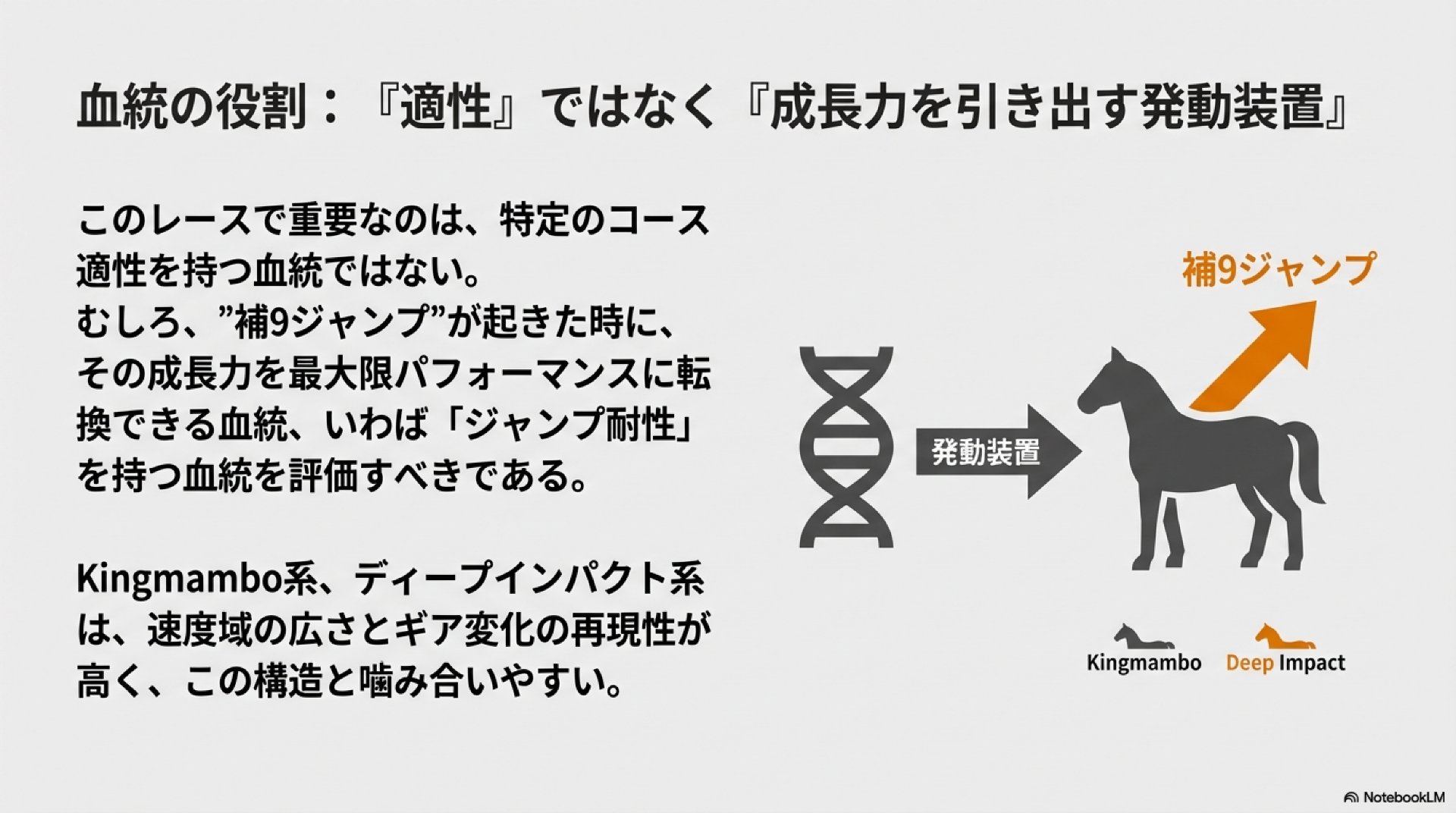 Kingmambo系やディープインパクト系が優勢なのは、これらが平均速度とギア変化の再現性に優れ、高いPCIを生み出しやすいから。成長力(補9ジャンプ)と勝ち切り能力(PCI)と血統(発動装置)が、ここで論理的に結合します。