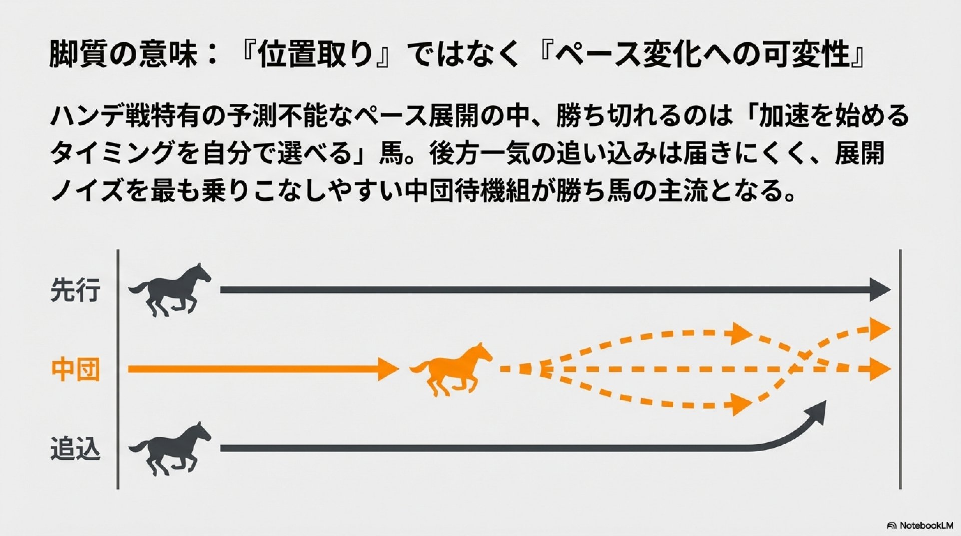 脚質 中団からの差しが多いのは、単なる位置取りの問題じゃない。ハンデ戦の不確定な展開に対応できる「ペース変化への追随能力」の高さを示してる。自分で加速のタイミングを選べる中団が、最も有利な展開を構築しやすい。