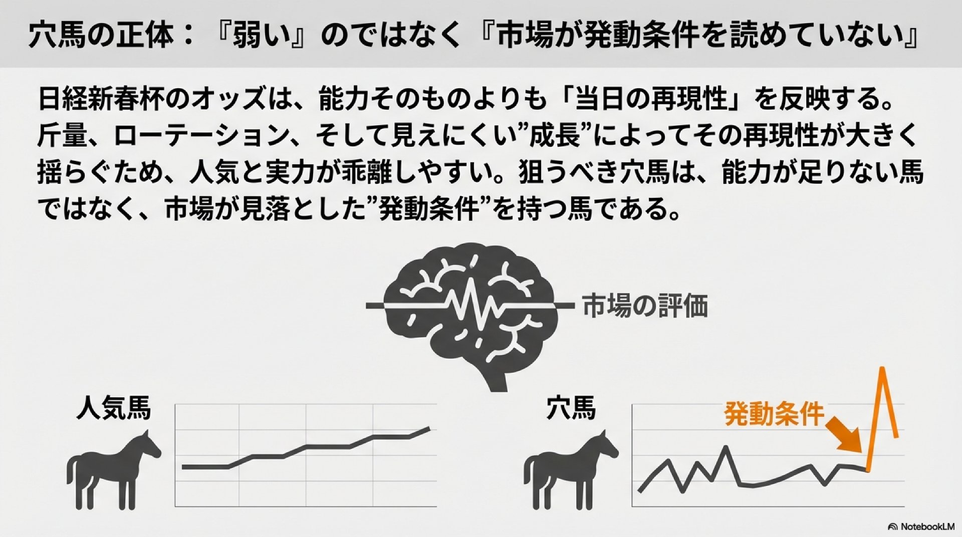 人気薄の好走は偶然じゃない。『人気薄=市場がその馬の発動条件(特に急激な補9ジャンプ)を正しく価格に織り込めていない』という、予測可能な構造的エラーの現れ。