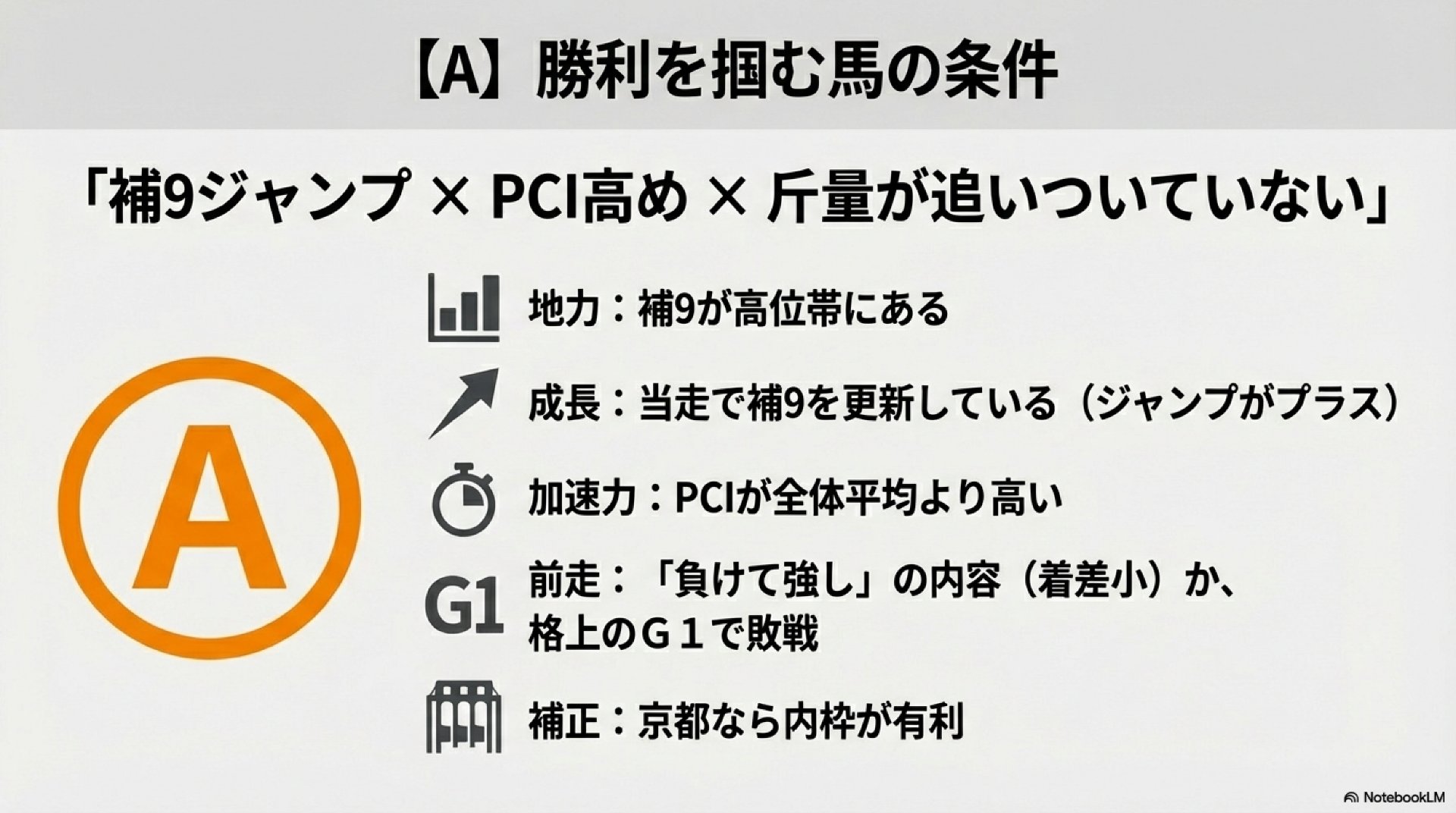 その「斤量が追いついていない」状態を最も鋭く可視化するのが「補9ジャンプ」。そして潜在能力を勝利に結びつける最後の一押しが「PCI」と「内枠(京都開催)」という勝ち切り補正因子。