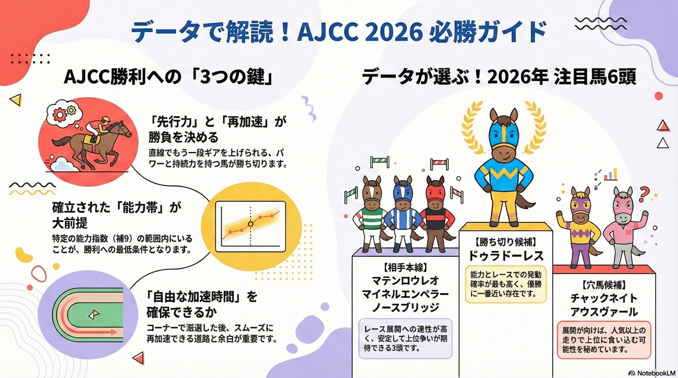 AJCCの勝ち筋は極めて明確。「先行からの再加速」にあり、その能力を持つ特定の「能力帯」の馬をデータで特定し、それぞれの「役割」に応じたポートフォリオを構築する。