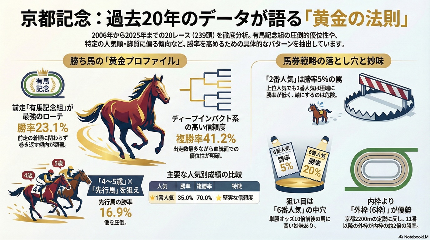 以下は、「過去20年(2006〜2025)の京都記念」データを、着順ではなく“着差”を優先して読み替えつつ、補9=能力階層(絶対値)/PCI=構造(自由加速時間)として混同しない前提で組み立てた分析です。
