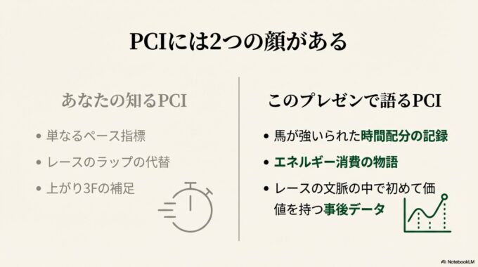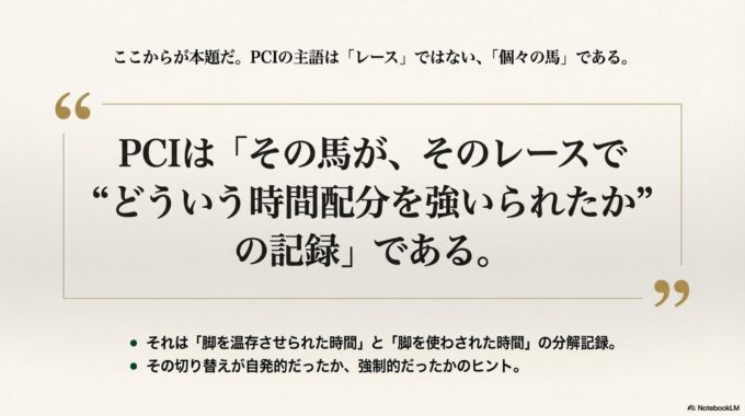 | PCI | 各競走馬 | その馬自身の走破タイム | 個々の馬が実際に体験したレース構造の記録 |