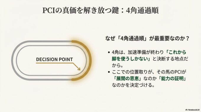 PCIの解釈において、なぜ「4コーナーの通過順位」が最重要ファクターとなるのか。その理由は、4コーナーが**「加速の準備が終わり、『これから脚を使うしかない』と全馬が決断を迫られる地点」**だからである。この地点での位置取りと、その後の時間配分(PCI)を組み合わせることで、数値の裏にある「体験構造」を鮮明に描き出すことができる。以下に3つの典型的なパターンを解説する。