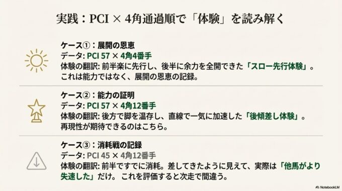 - PCIは文脈の中で初めて価値を持つ PCIは常に事後データである。数値単体には予測的な価値はほとんどない。その価値は、通過順位やレース全体の構造といった文脈に置かれたときに初めて生まれる。