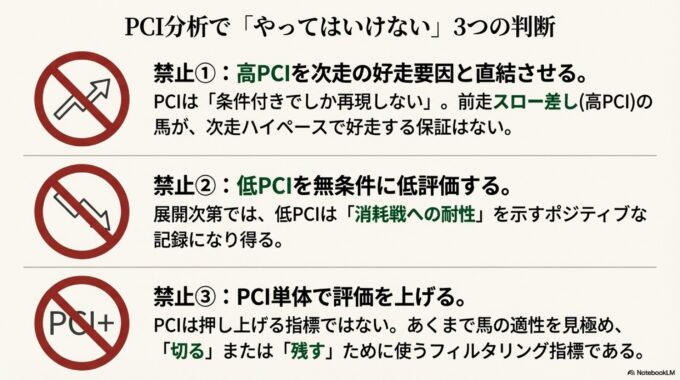 - 分析の文脈化を徹底する: 全てのアナリストは、PCIを評価する際に、必ず**「4角通過順位」と「レース全体の構造(RPCI/PCI3)」**を併記し、常に文脈の中で評価することを業務プロセスとして徹底する。これにより、数値の単体評価という最も危険な誤用を構造的に防止する。