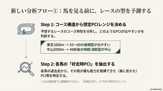 - ステップ1:コース構造から想定PCIレンジを決定する まず、対象レースのコース形態や距離から、どのようなPCIレンジが好走に結びつきやすいかを事前に想定する。