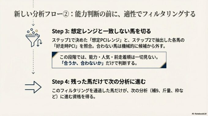 - ステップ3:想定レンジと一致しない馬をフィルタリング(消去)する ステップ1で設定した「想定PCIレンジ」と、ステップ2で抽出した各馬の「好走時PCI」を照合する。この段階では能力、人気といった要素は一切考慮せず、純粋に**「今回のレース構造に合うか/合わないか」**という適性の観点のみでフィルタリングする。