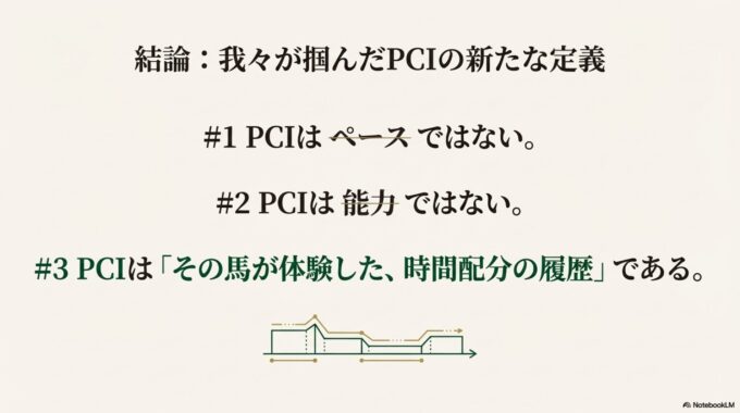- PCI 50は「体験の均衡点」である PCI 50を単純な「平均ペース」と理解するのは不正確である。より厳密には、その馬にとって**「前半と後半の負荷がほぼ等しかった」という体験の均衡点**を示す。楽でもなく、苦しくもない、エネルギーを均等に消費した状態を記録した数値と捉えるべきである。