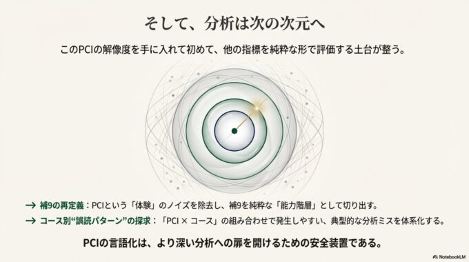 本レポートで展開した議論を総括すると、PCIは単なるペース指標ではなく、**「その馬が体験した、時間配分の履歴」**であるという核心的なコンセプトに行き着く。この視点に立つことで、我々は数値の表面的な大小に惑わされることなく、競走馬一頭一頭の「適性」を正確に見抜き、目標とするレースで問われる展開構造とのマッチング精度を劇的に向上させることが可能になる。PCIは能力を測るものではなく、能力が発揮される「型」を特定するための、極めて強力な分析ツールである。